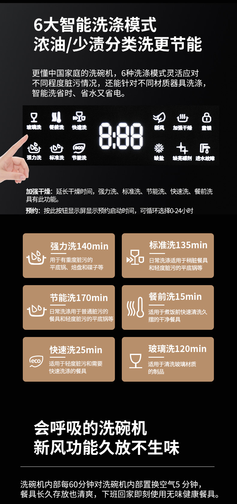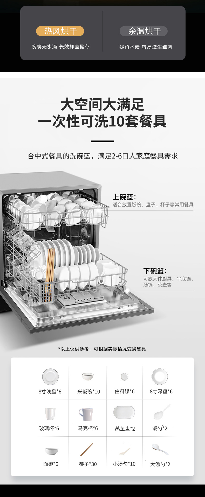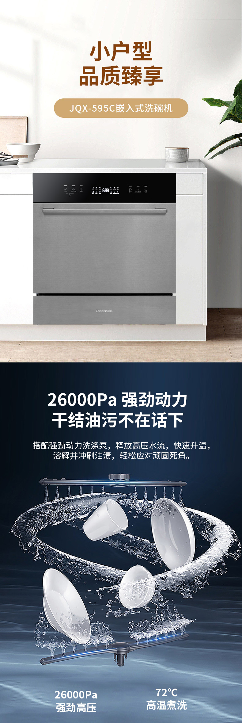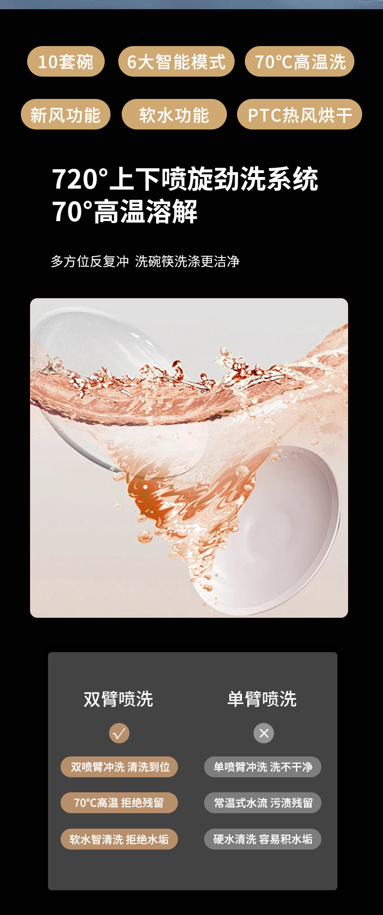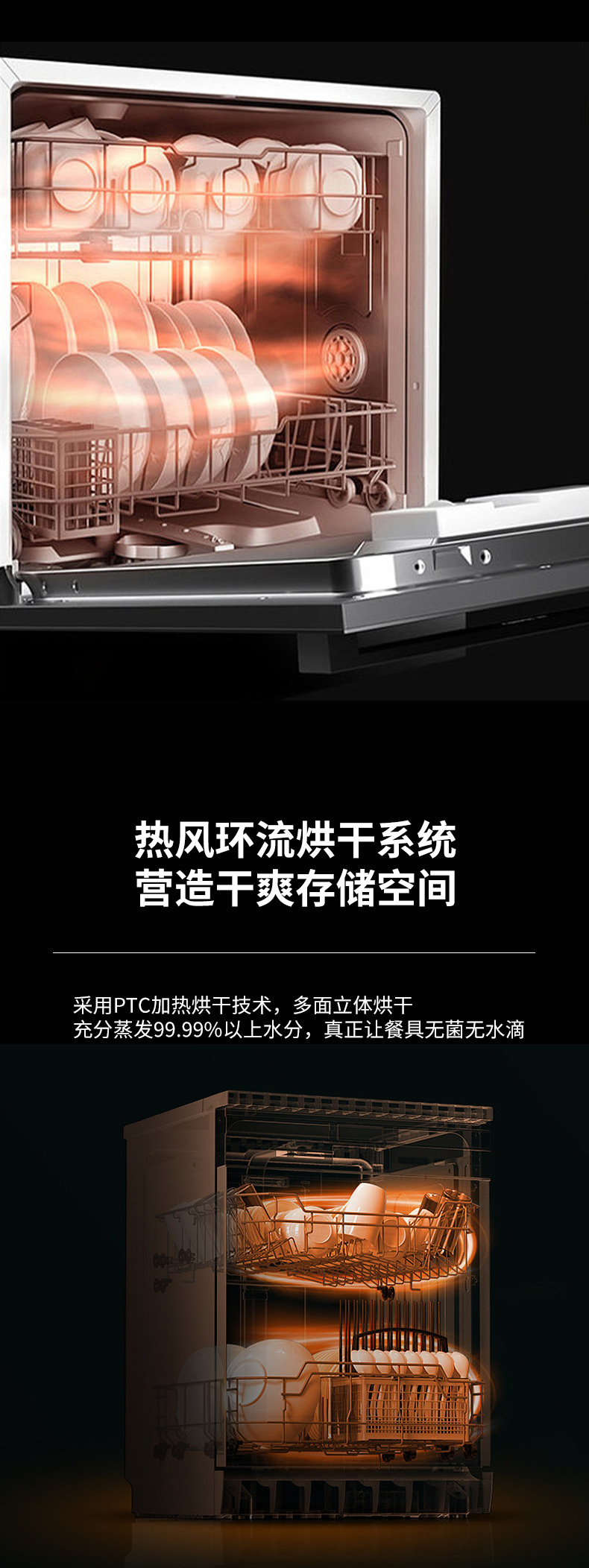 強勁高壓,高溫煮洗,10套碗,新風+軟水功能,PTC熱風烘干。